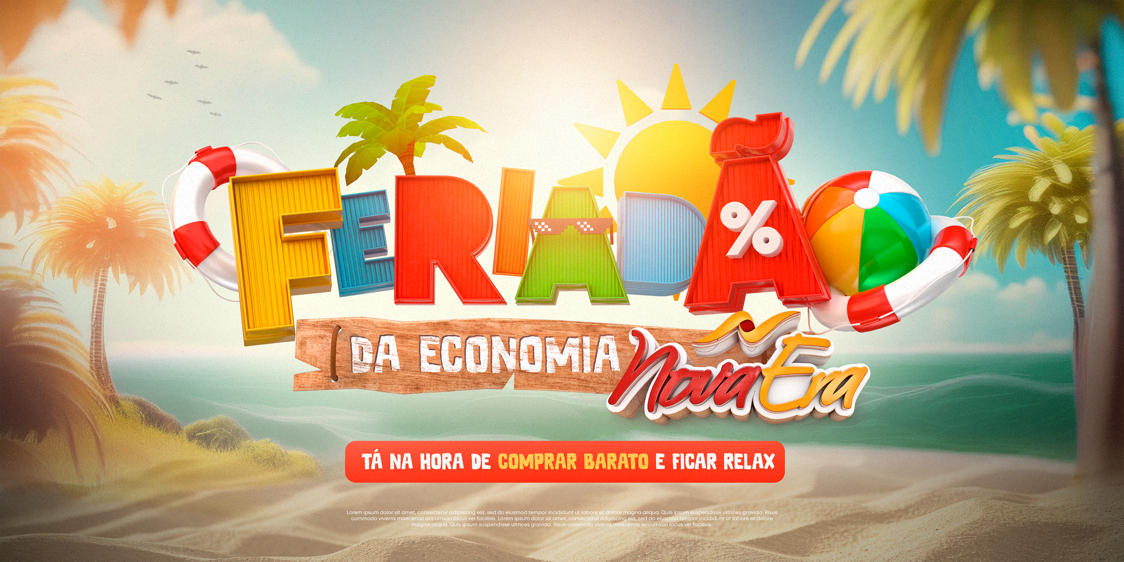 Com mood praiano e lettering 3D descontraído, essa peça transmite o espírito de relaxar enquanto aproveita grandes ofertas no feriadão.