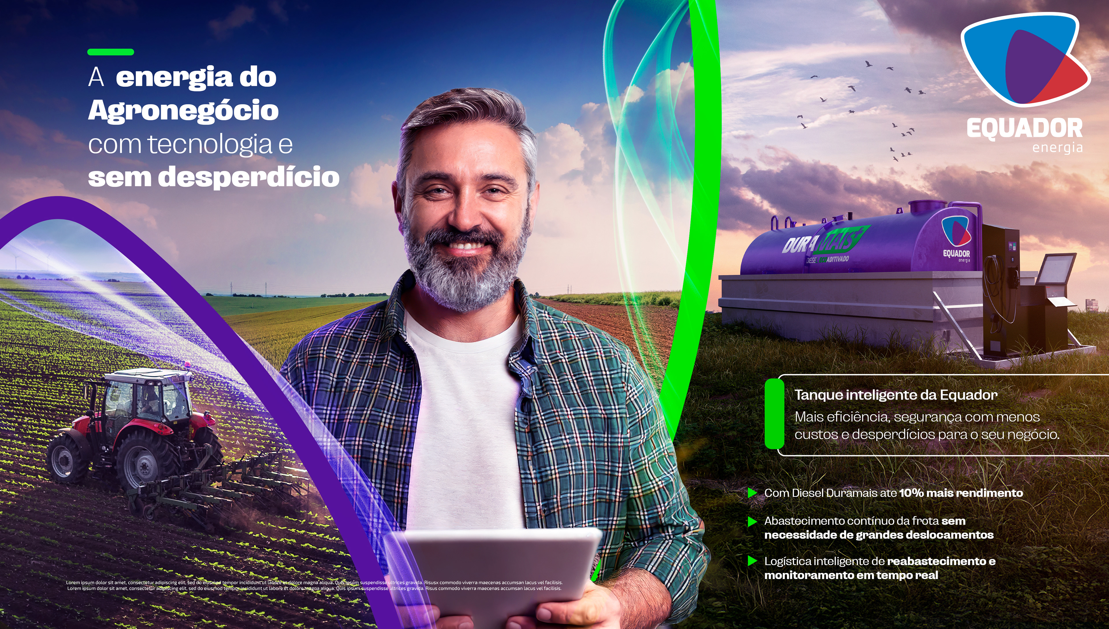 Visual limpo e institucional voltado ao agronegócio. O tanque 3D em destaque reforça a inovação da marca e o compromisso com tecnologia e eficiência no campo.