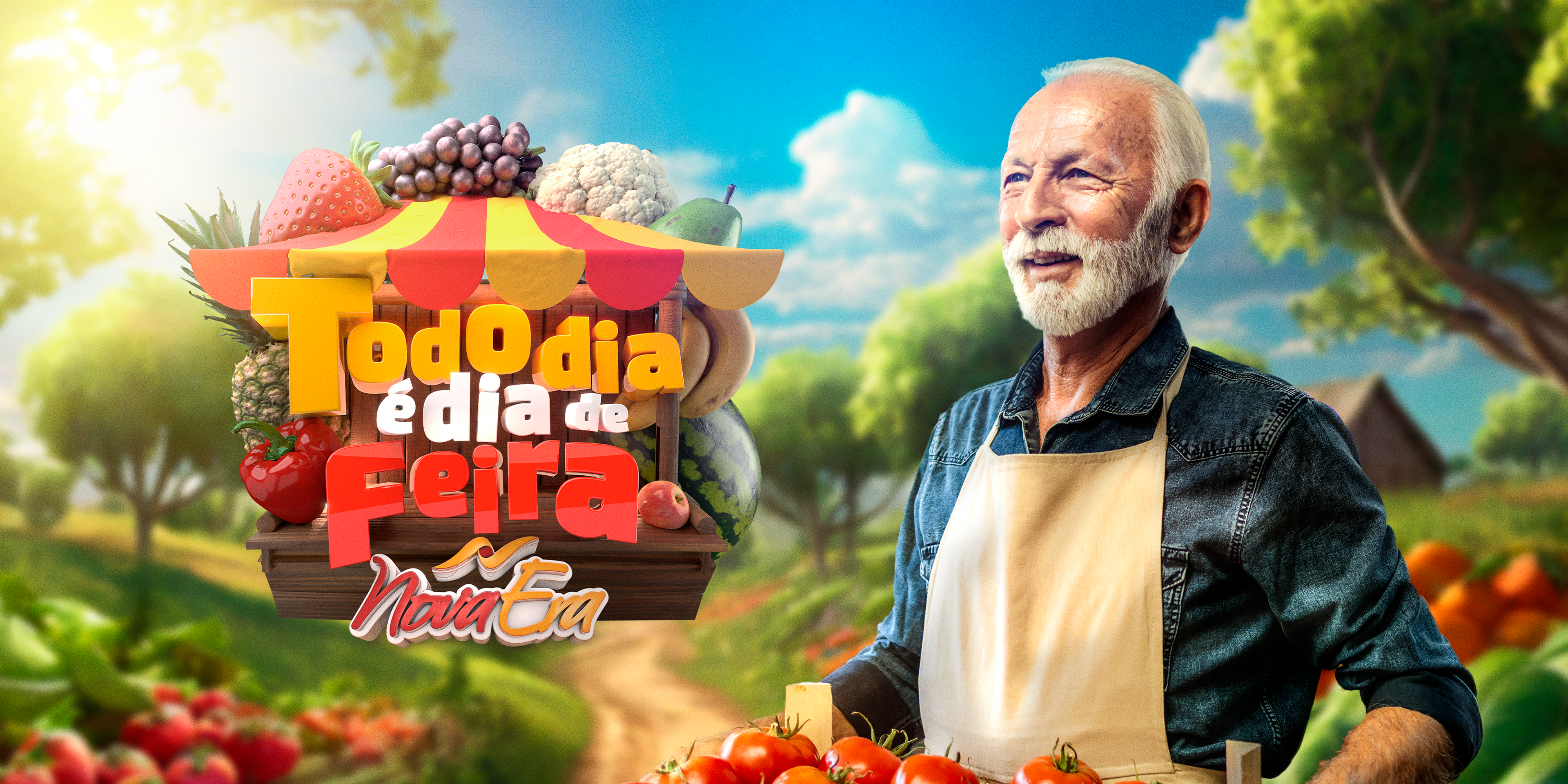 Campanha com estética rural, misturando fotografia e ilustração 3D. O lettering na estrutura da barraca remete à feira tradicional, valorizando o frescor e a proximidade com o produtor.